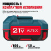 - Аккумуляторная система 21Vmax ALTECO — один аккумулятор на все инструменты линейки, без лишних затрат и с полной совместимостью.