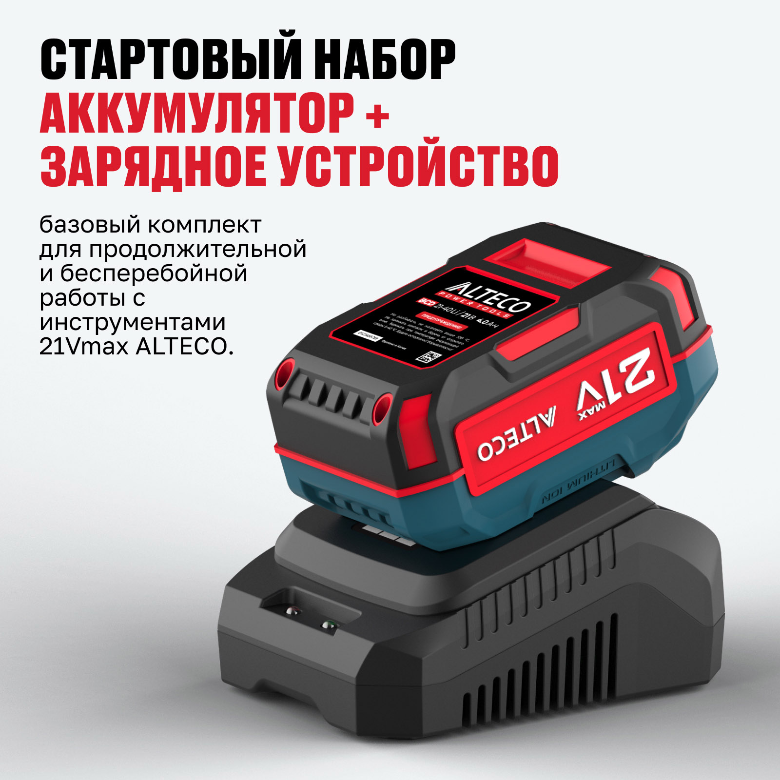 - Аккумуляторная система 21Vmax ALTECO — один аккумулятор на все инструменты линейки, без лишних затрат и с полной совместимостью.