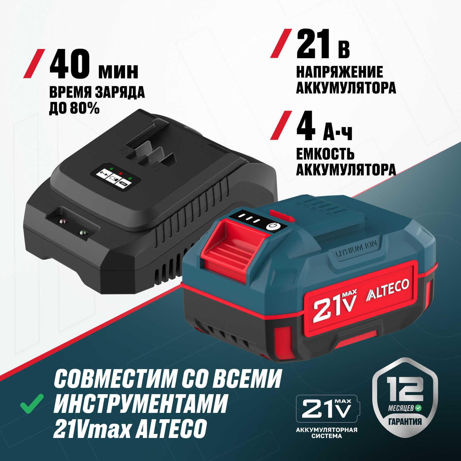 - Разработан для аккумуляторной системы 21Vmax ALTECO — совместим со всеми аккумуляторами серии, обеспечивая универсальность.
