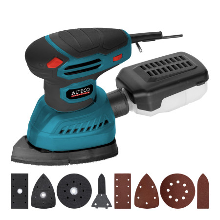 - Многофункциональный 4в1 — в комплекте 4 сменные подошвы, которые позволяют использовать инструмент для разных задач: от точной обработки углов до быстрой шлифовки больших поверхностей.