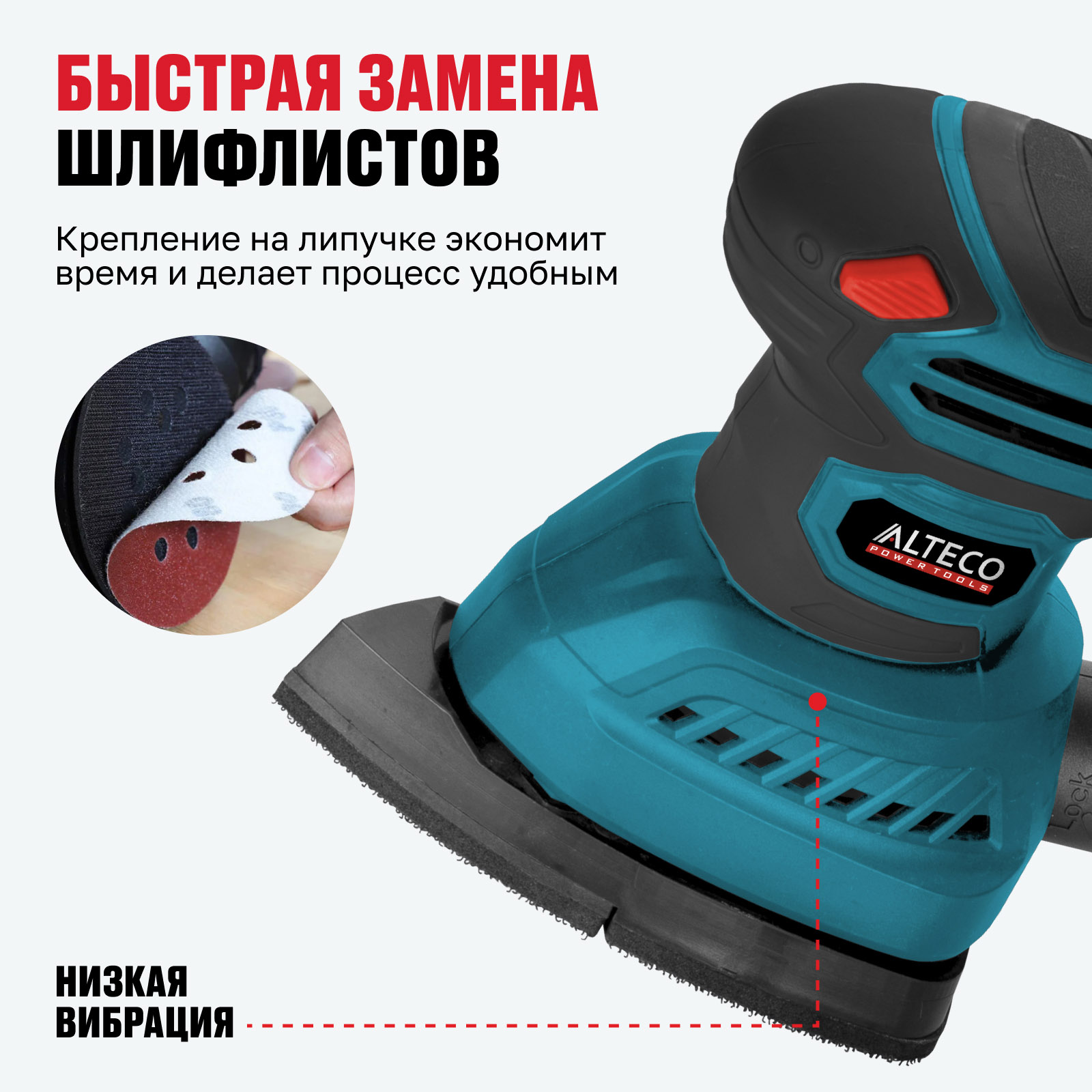 - Быстрая замена шлифлистов — крепление на липучке экономит время и делает процесс удобным